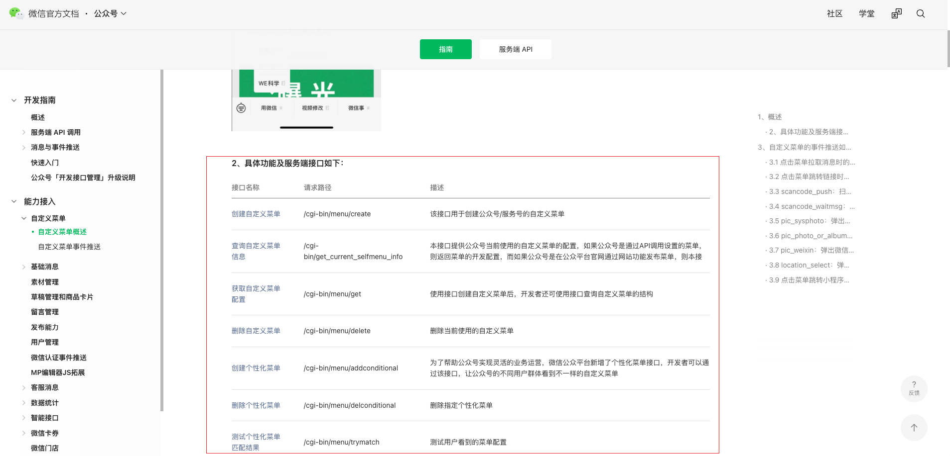 - 善用“搜索”而非“提问”: 相比于让 AI 总结,直接在官方文档中搜索关键字(如 menu/create),查看官方的请求参数定义,准确率远高于 AI 生成的回答。